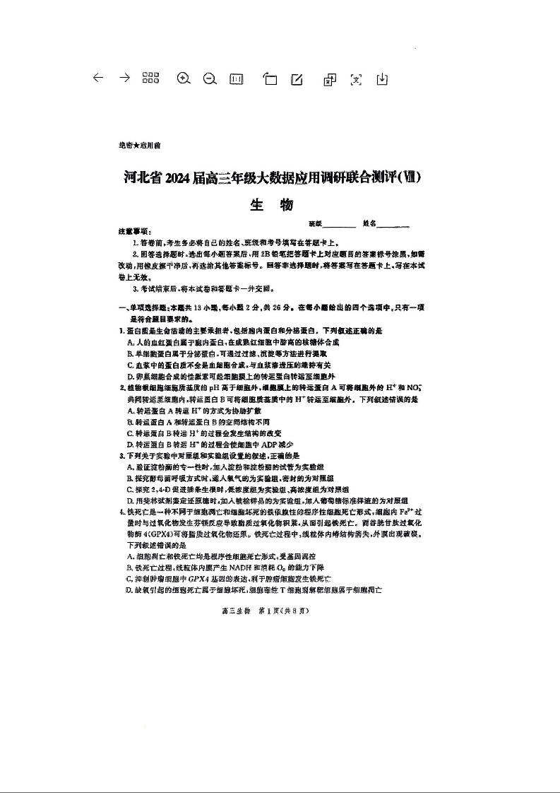 河北省2024届高三年级下学期大数据应用调研联合测评(Ⅷ)生物