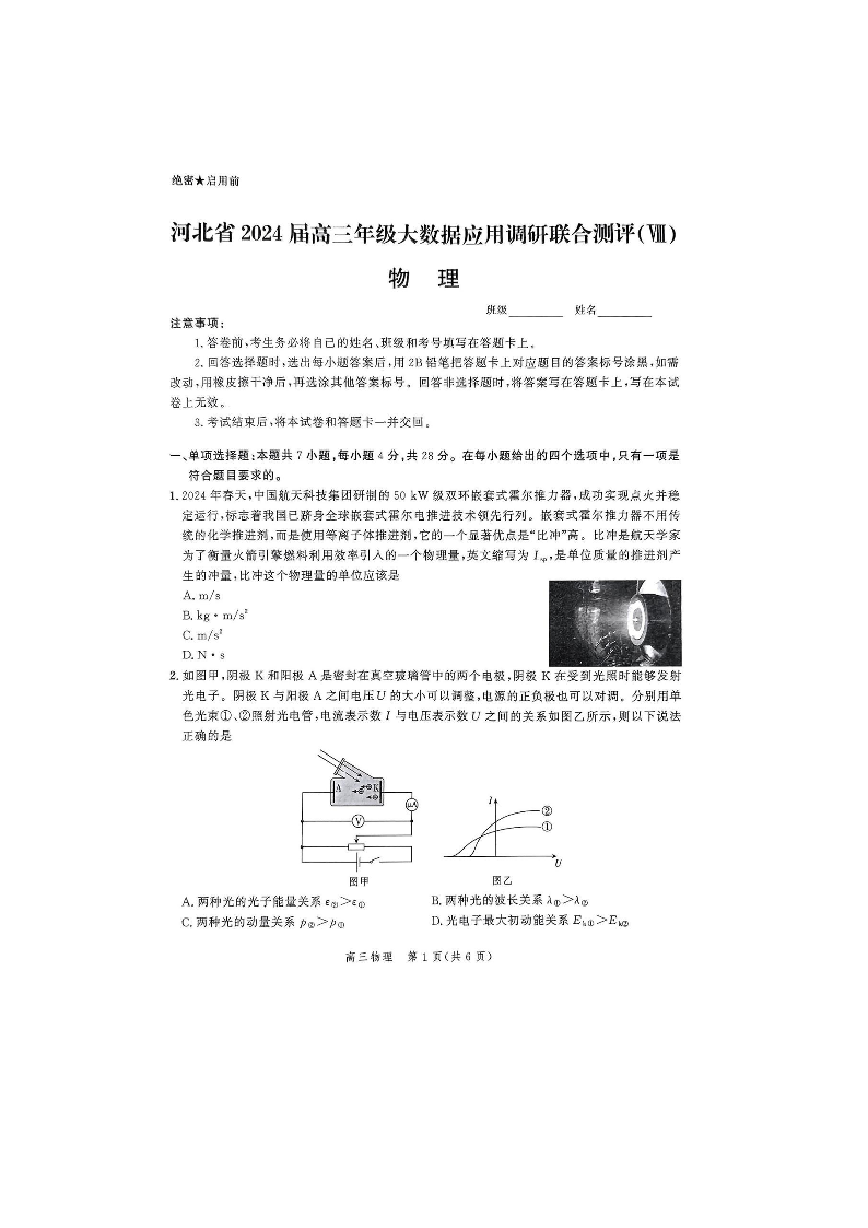 河北省2024届高三年级下学期大数据应用调研联合测评(Ⅷ)物理