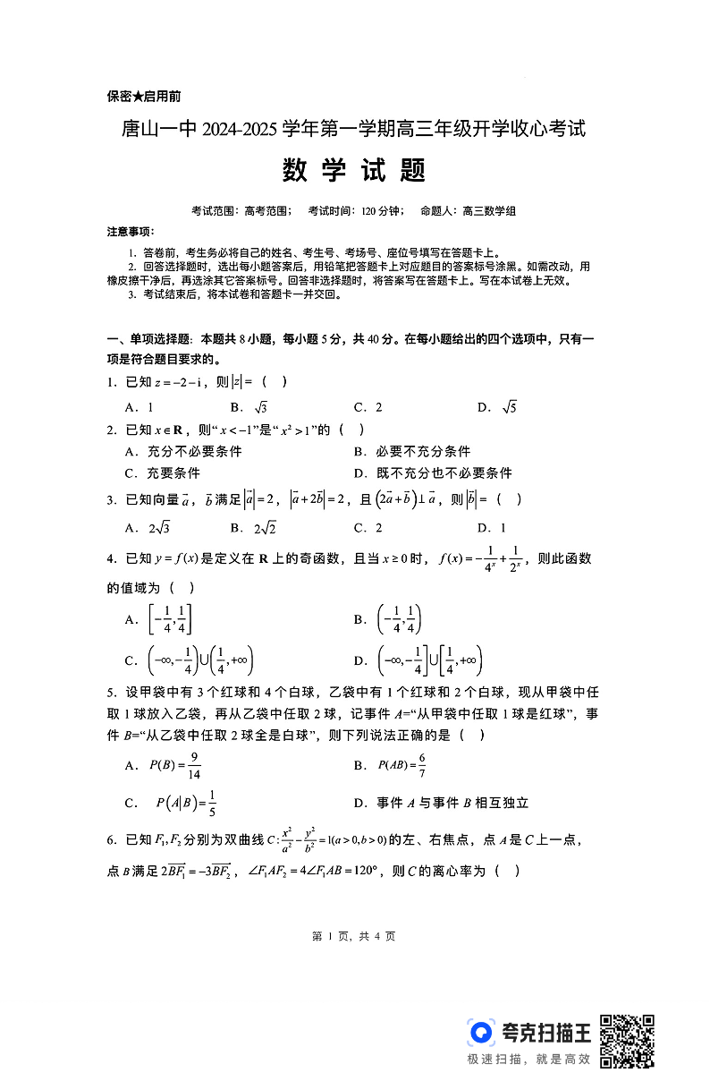 河北省唐山市第一中学2024-2025学年高三上学期开学收心考试+数学