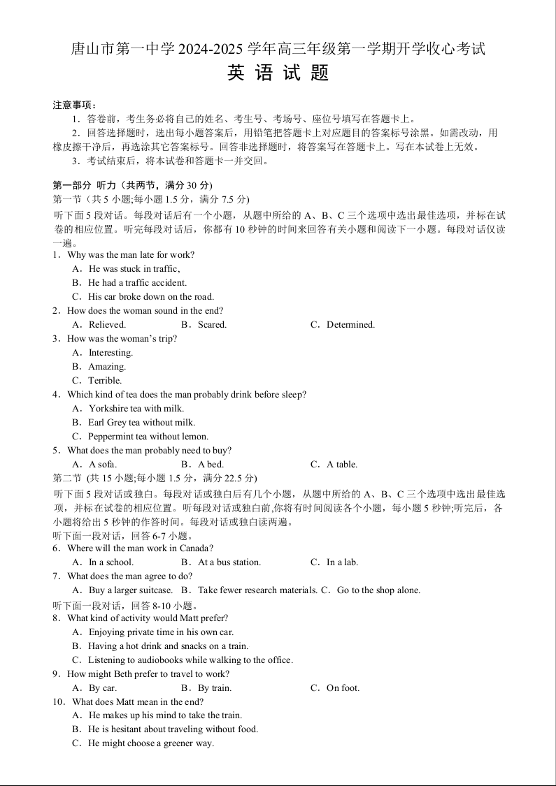 河北省唐山市第一中学2024-2025学年高三上学期开学收心考试+英语