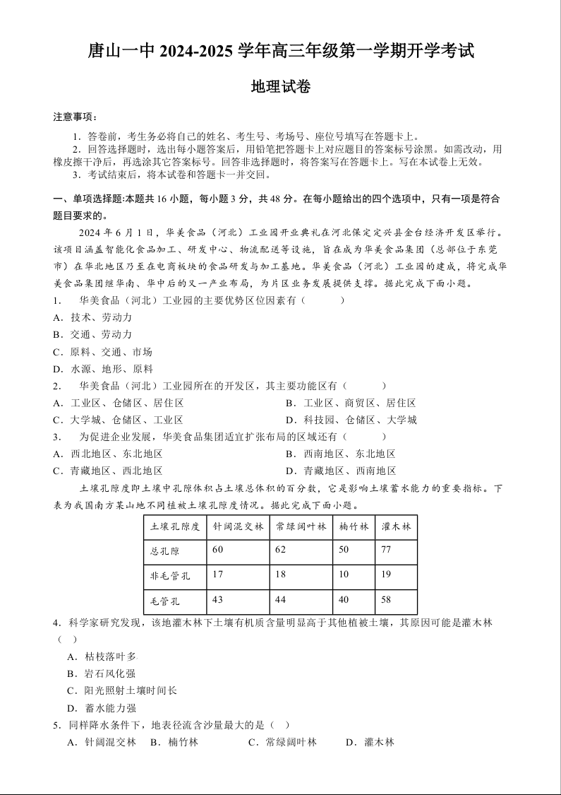 河北省唐山市第一中学2024-2025学年高三上学期开学收心考试+地理