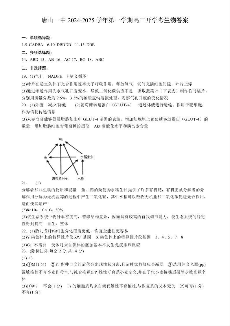 河北省唐山市第一中学2024-2025学年高三上学期开学收心考试+生物答案