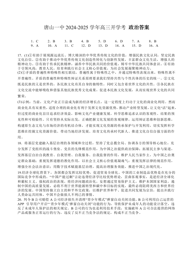 河北省唐山市第一中学2024-2025学年高三上学期开学收心考试+政治答案