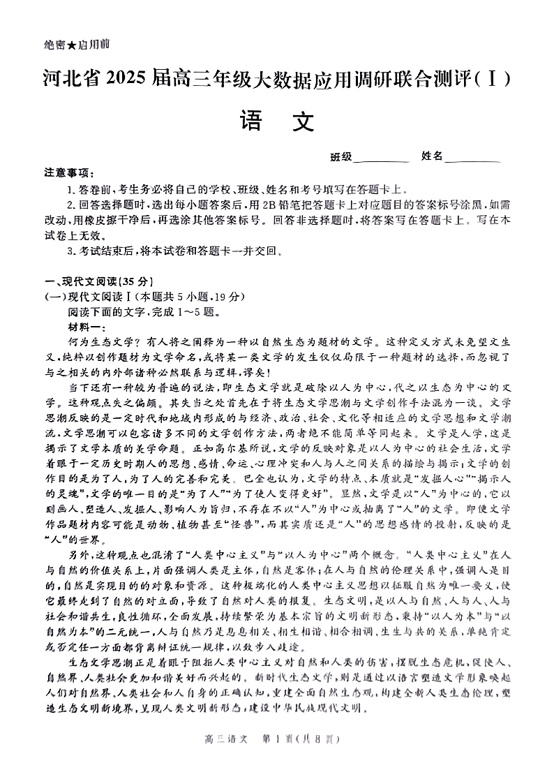 河北省2025届高三大数据9月应用调研联合测评(Ⅰ)语文