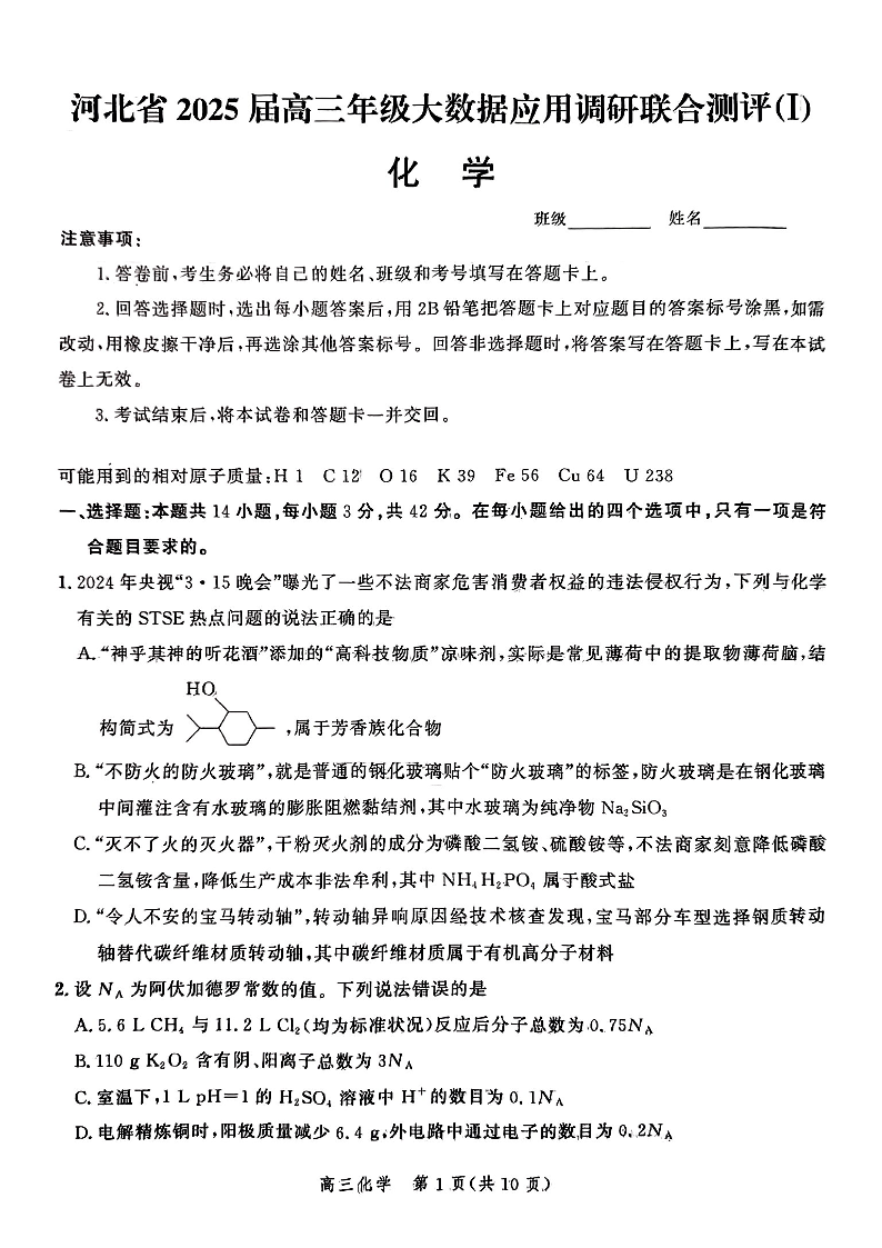 河北省2025届高三大数据9月应用调研联合测评(Ⅰ)化学