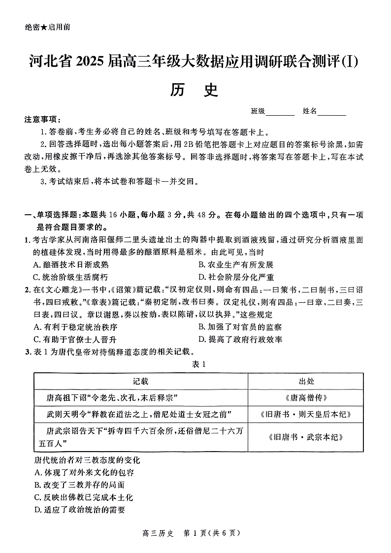 河北省2025届高三大数据9月应用调研联合测评(Ⅰ)历史