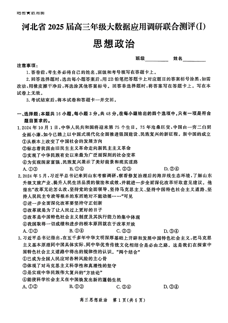 河北省2025届高三大数据9月应用调研联合测评(Ⅰ)政治