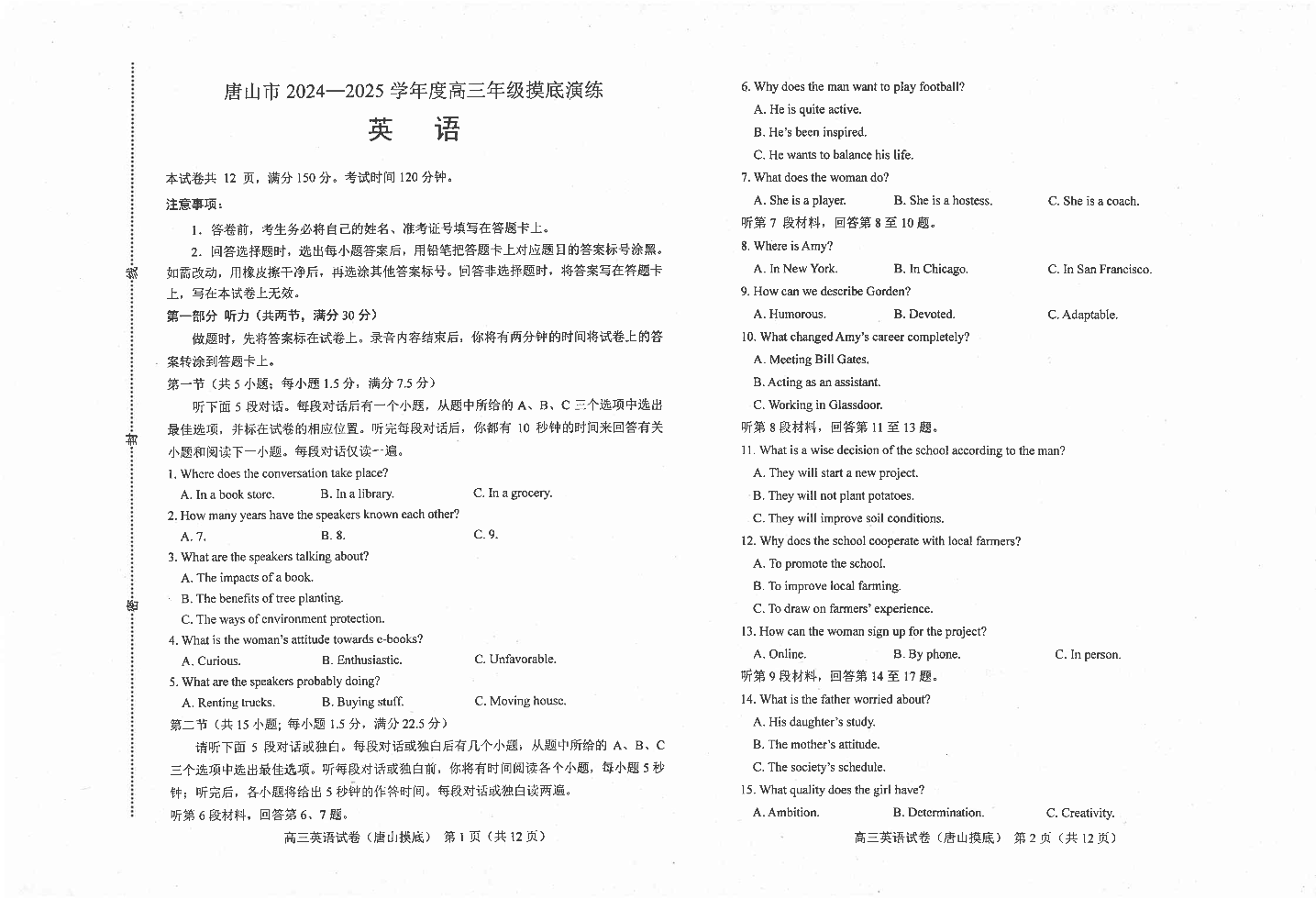 河北省唐山市2024-2025学年高三上学期摸底演练+英语