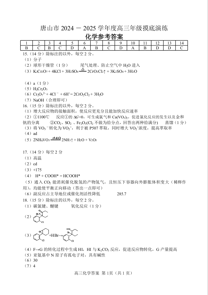 河北省唐山市2024-2025学年高三上学期摸底演练+化学答案