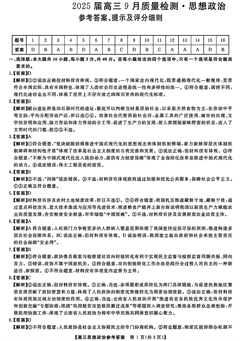 金科大联考·2025届高三9月质量检测+政治答案