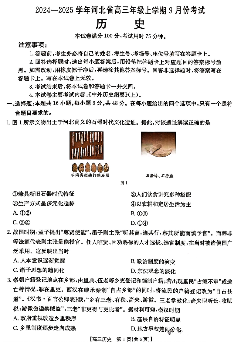 河北省2024-2025学年高三年级上学期9月份考试+历史
