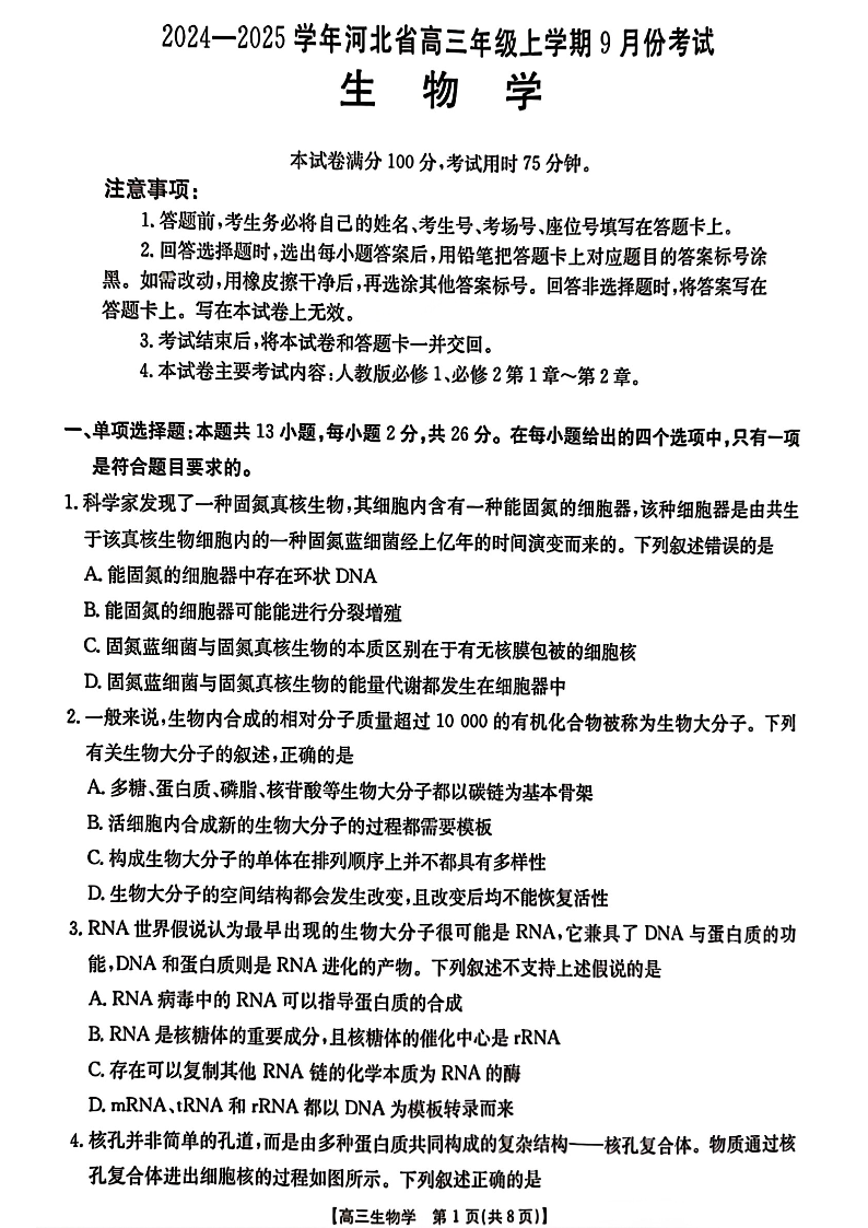 河北省2024-2025学年高三年级上学期9月份考试+生物