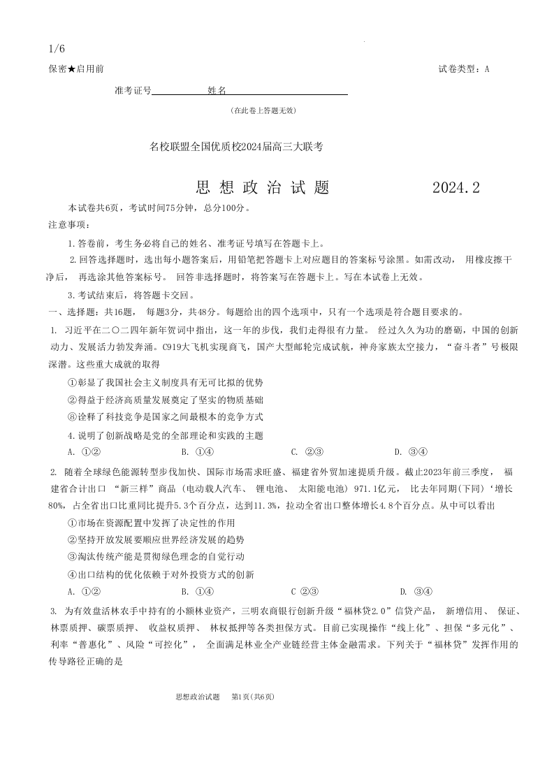 2024届福建省名校联盟全国优质校高三上学期2月大联考 政治
