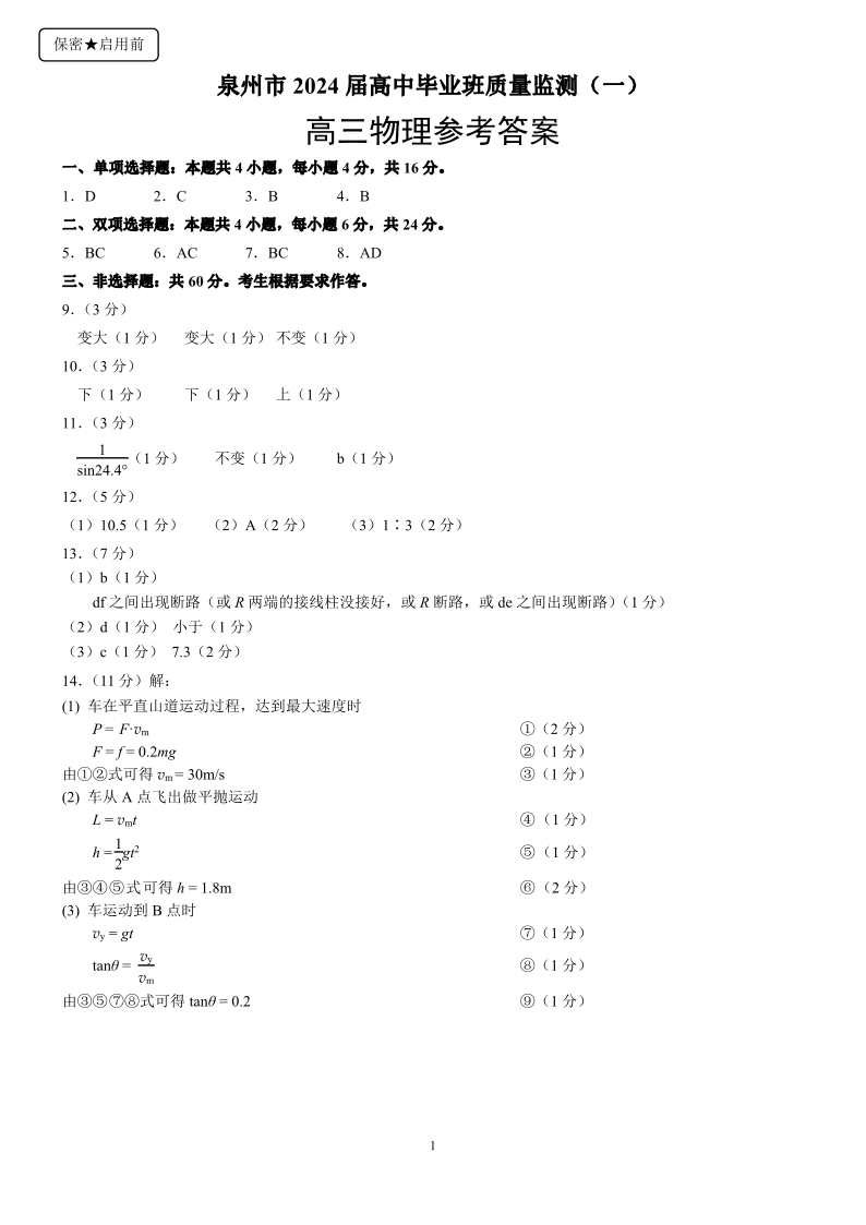 2024届福建省泉州市高中毕业班质量检测(一)物理答案