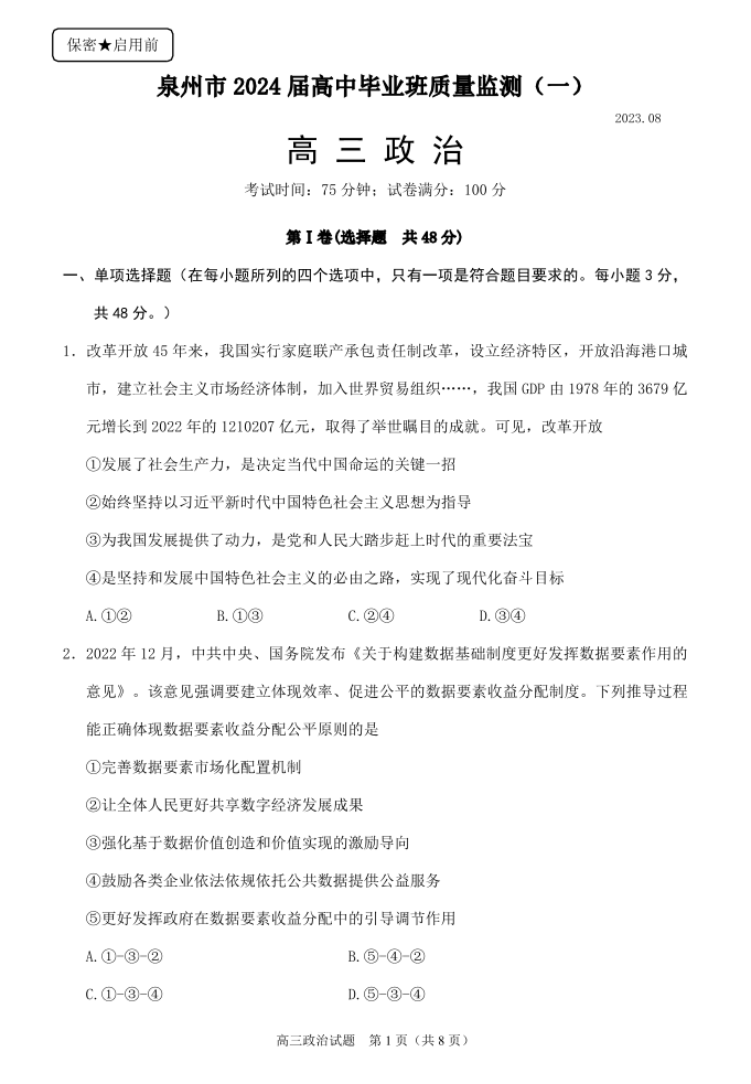 2024届福建省泉州市高中毕业班质量检测(一)政治