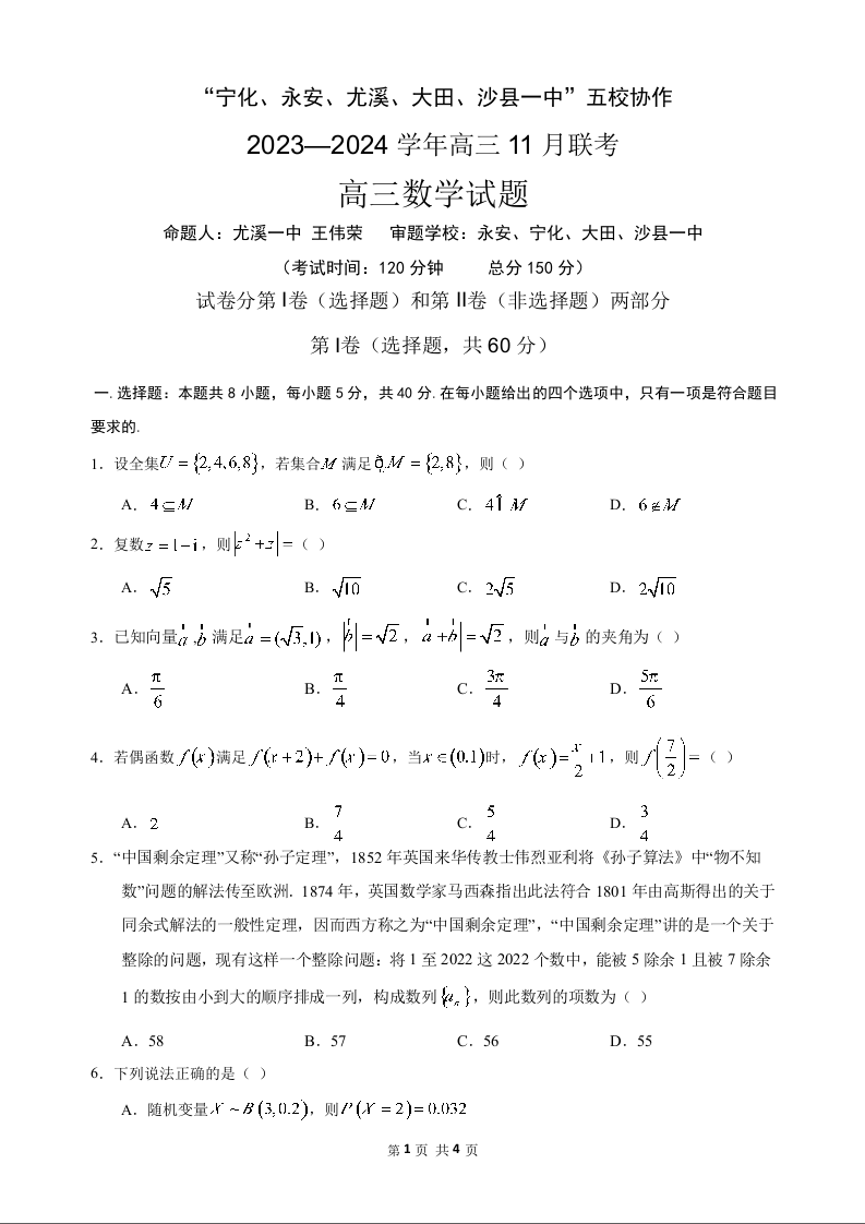 福建省“宁化、永安、尤溪、大田、沙县一中”五校协作2023-2024学年高三上学期11月联考 数学
