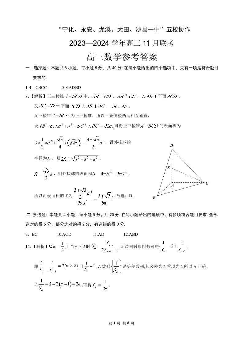 福建省“宁化、永安、尤溪、大田、沙县一中”五校协作2023-2024学年高三上学期11月联考 数学答案