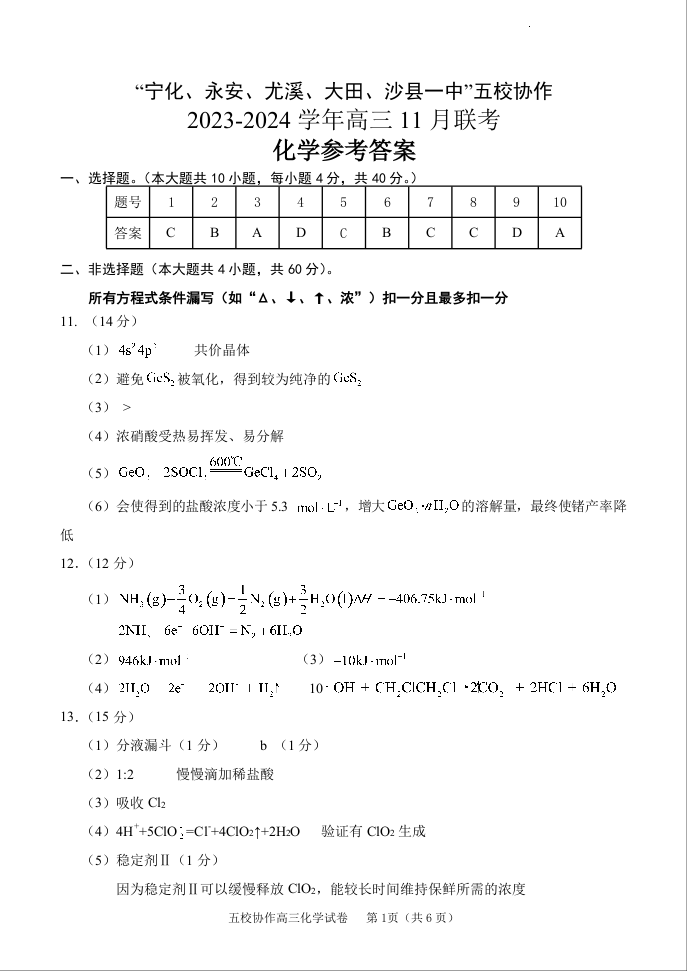 福建省“宁化、永安、尤溪、大田、沙县一中”五校协作2023-2024学年高三上学期11月联考 化学答案