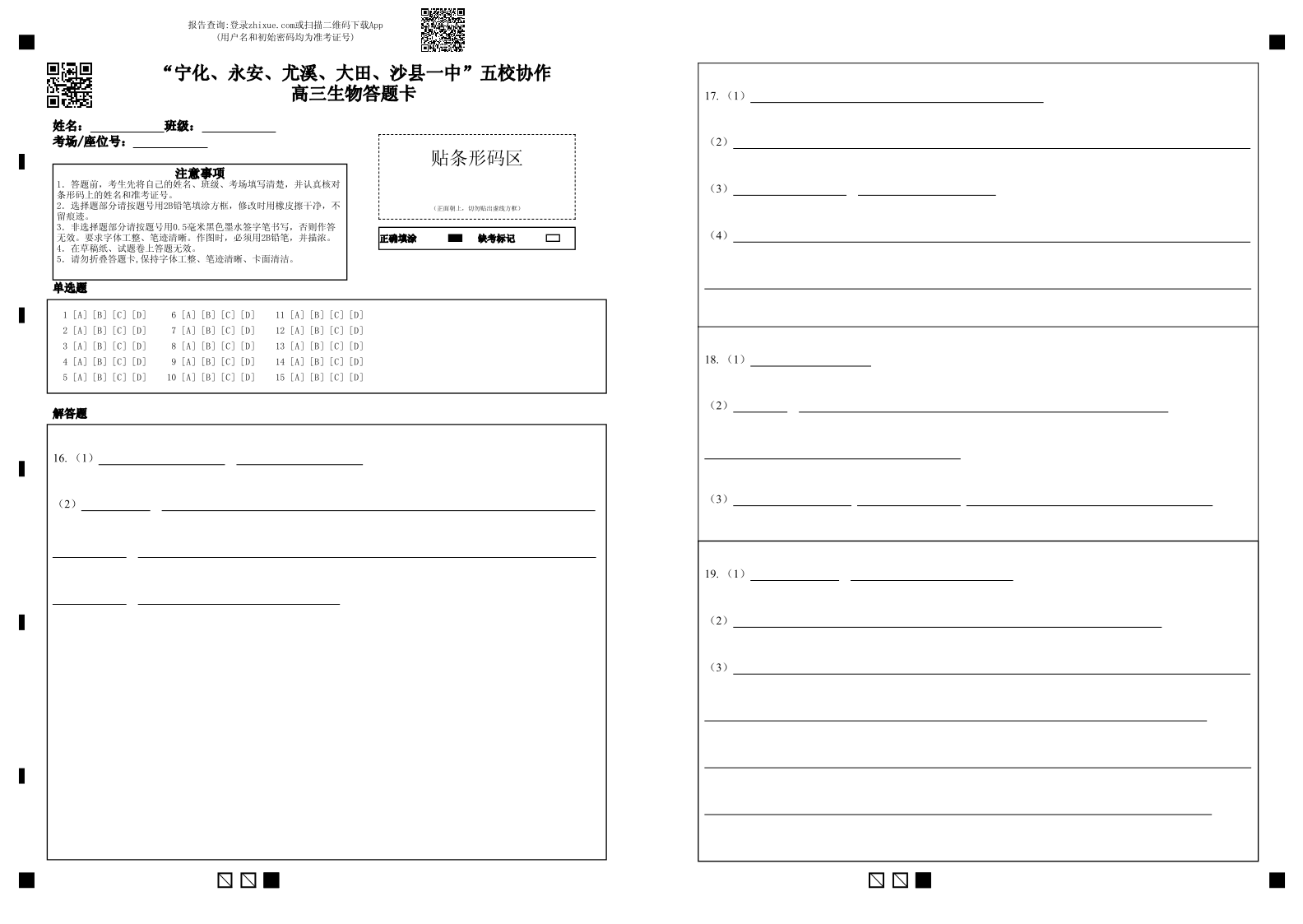 福建省“宁化、永安、尤溪、大田、沙县一中”五校协作2023-2024学年高三上学期11月联考 生物答题卡