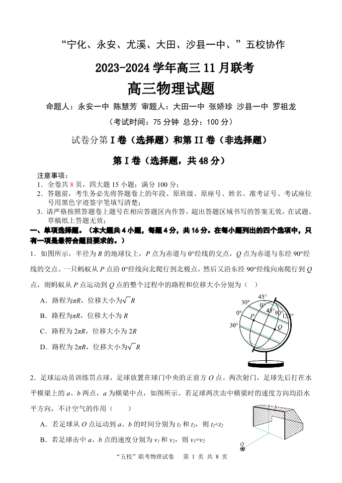 福建省“宁化、永安、尤溪、大田、沙县一中”五校协作2023-2024学年高三上学期11月联考 物理