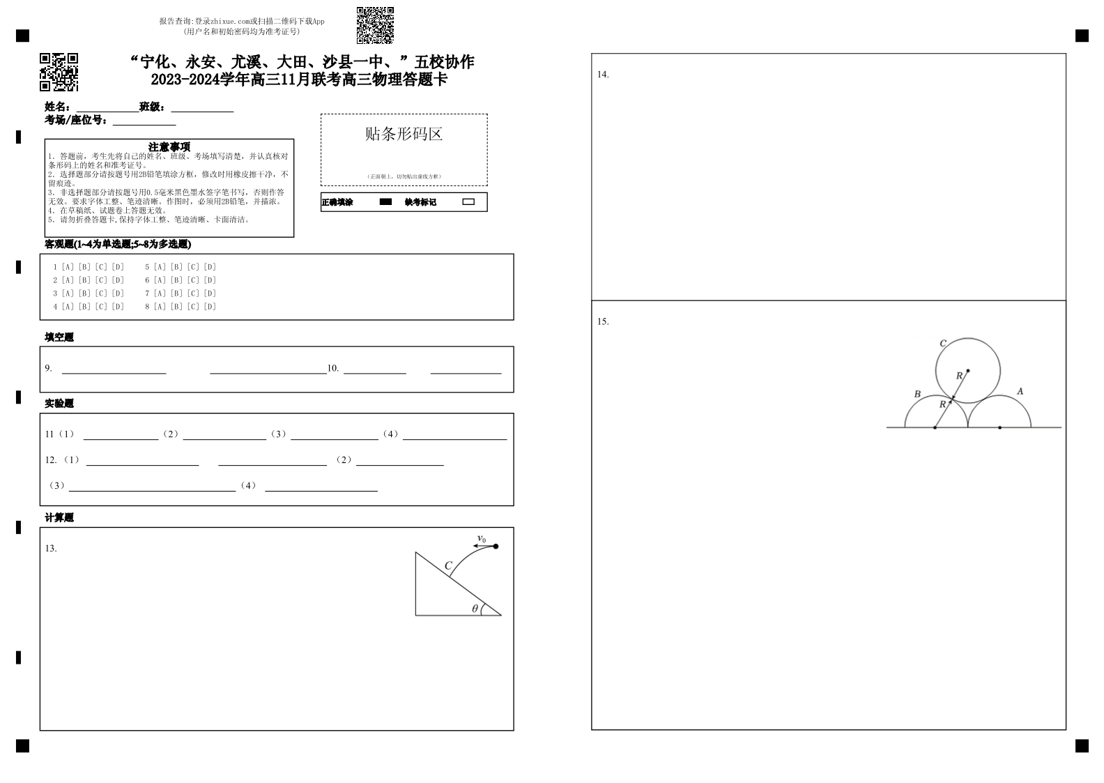 福建省“宁化、永安、尤溪、大田、沙县一中”五校协作2023-2024学年高三上学期11月联考 物理答题卡