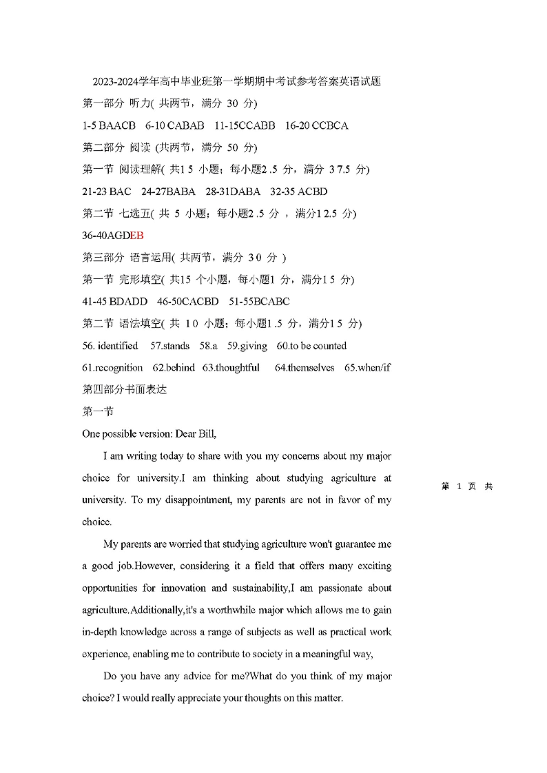 福建省百校联考2023-2024学年高三上学期期中考试 英语答案