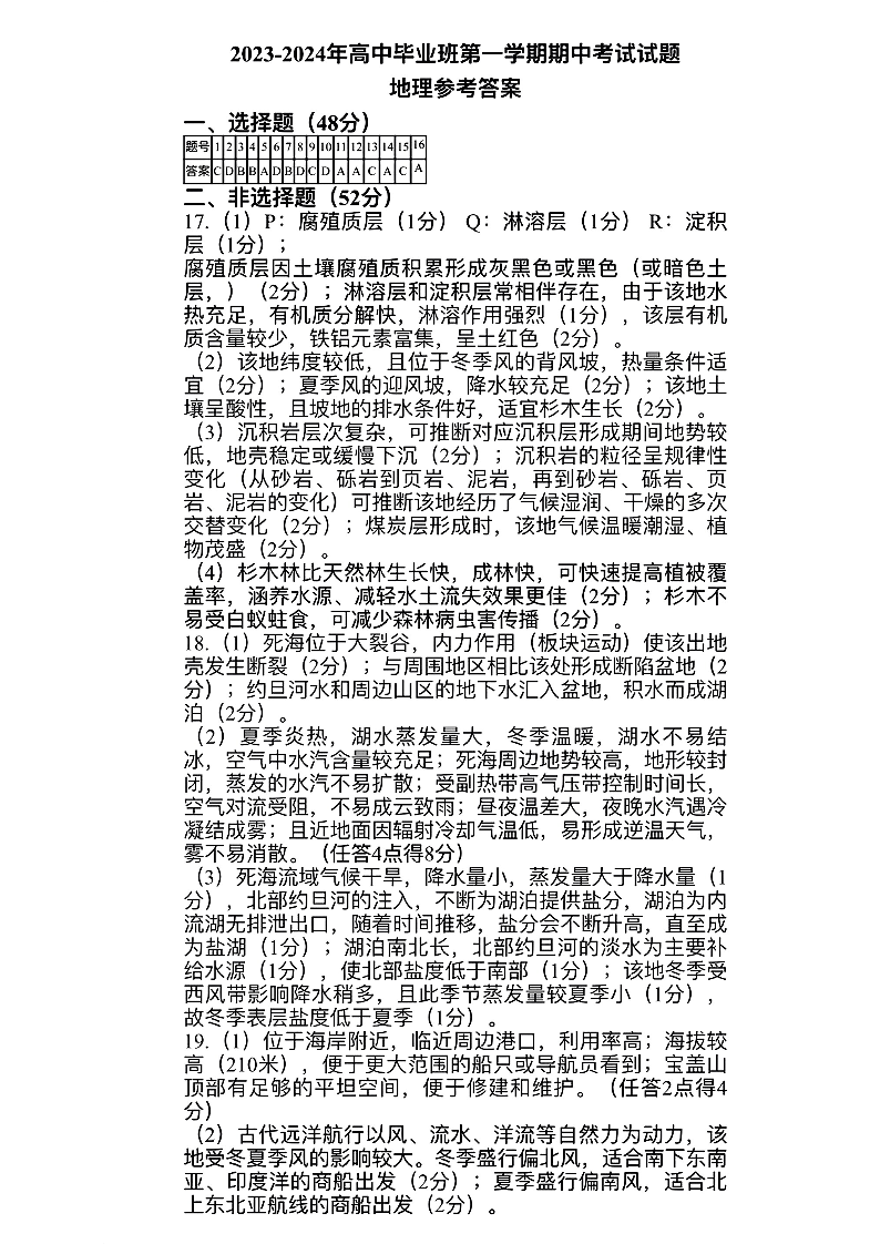福建省百校联考2023-2024学年高三上学期期中考试 地理答案