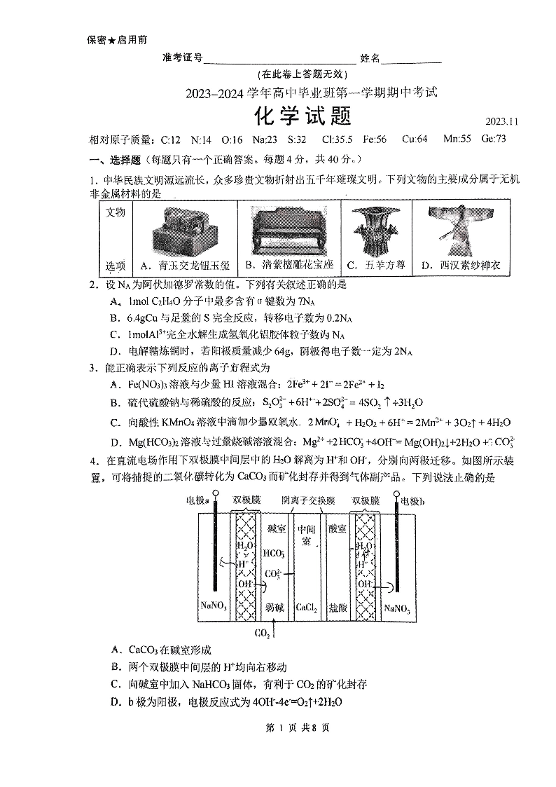 福建省百校联考2023-2024学年高三上学期期中考试 化学