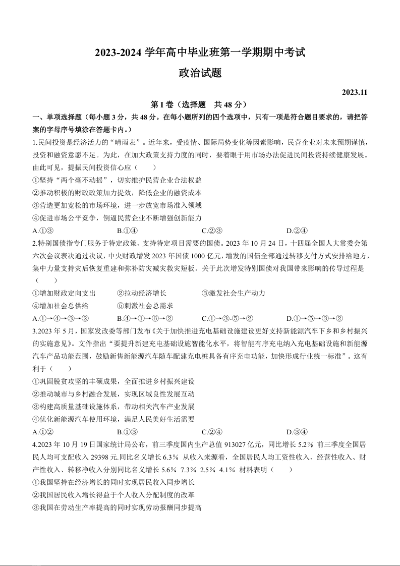 福建省百校联考2023-2024学年高三上学期期中考试 政治