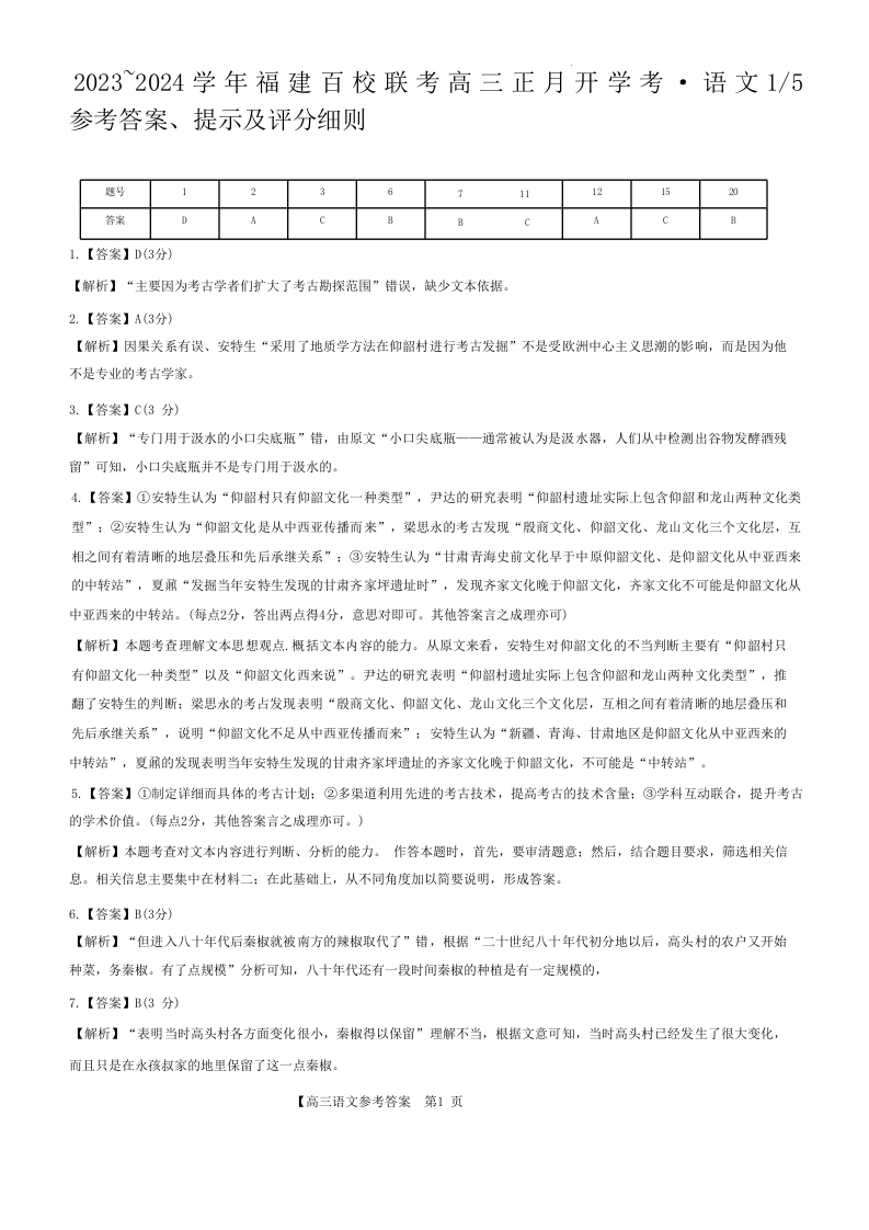 福建省百校联考2023-2024学年高三下学期正月开学考试 语文答案