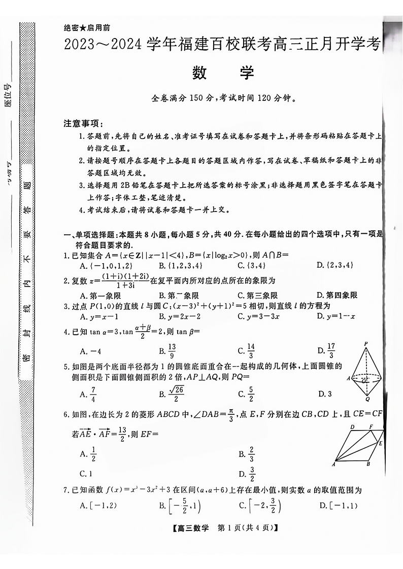 福建省百校联考2023-2024学年高三下学期正月开学考试 数学