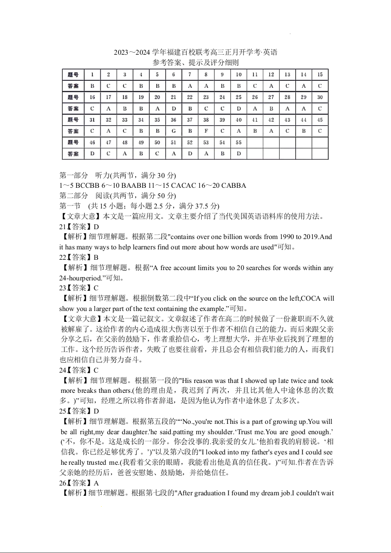 福建省百校联考2023-2024学年高三下学期正月开学考试 英语答案