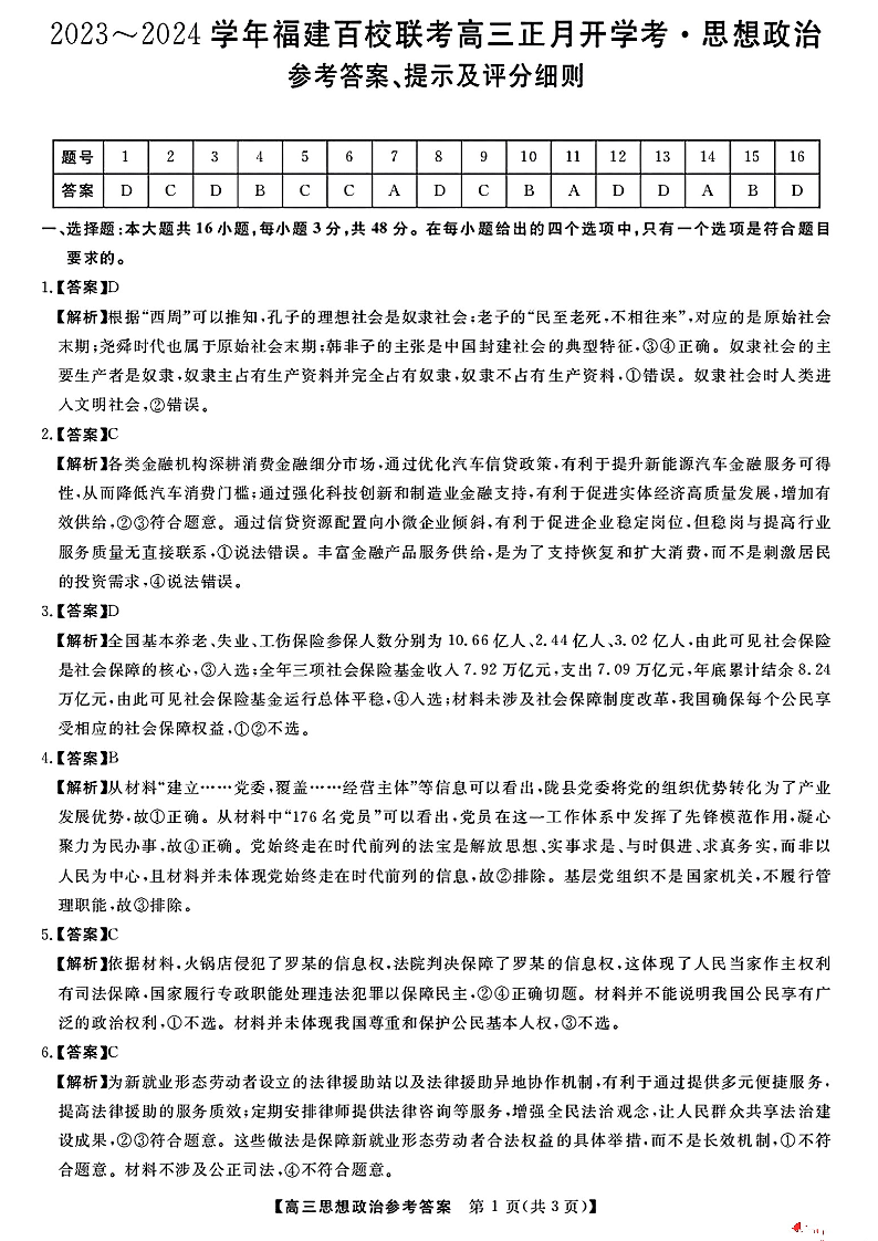 福建省百校联考2023-2024学年高三下学期正月开学考试 政治答案
