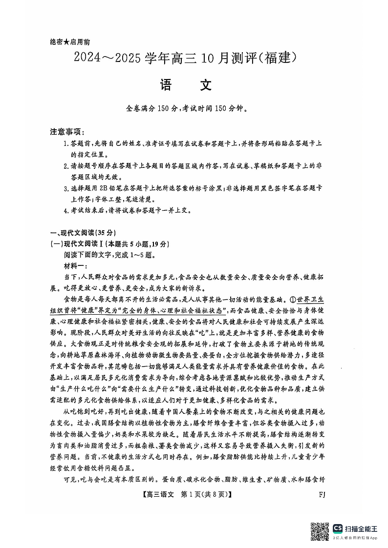 福建省百校联考2024-2025学年高三上学期10月测评+语文