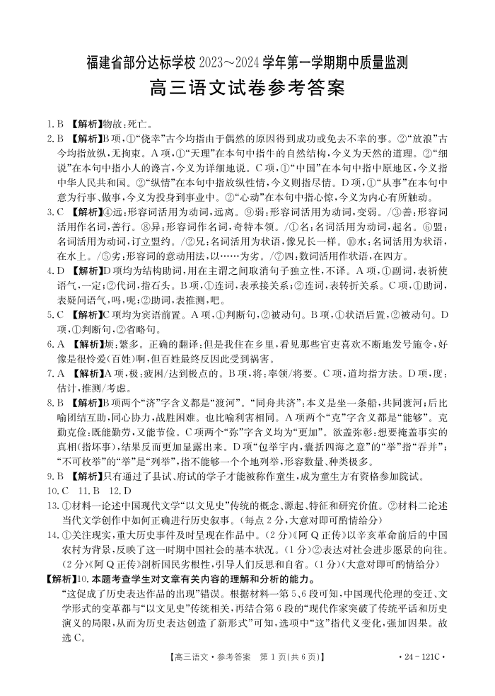 福建省部分达标学校2023-2024学年高三上学期期中质量监测 语文答案
