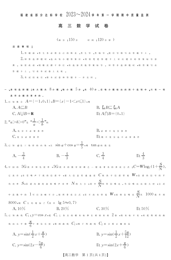 福建省部分达标学校2023-2024学年高三上学期期中质量监测 数学