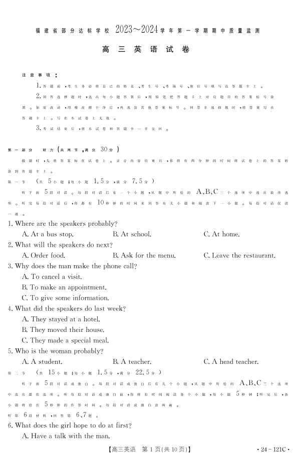 福建省部分达标学校2023-2024学年高三上学期期中质量监测 英语