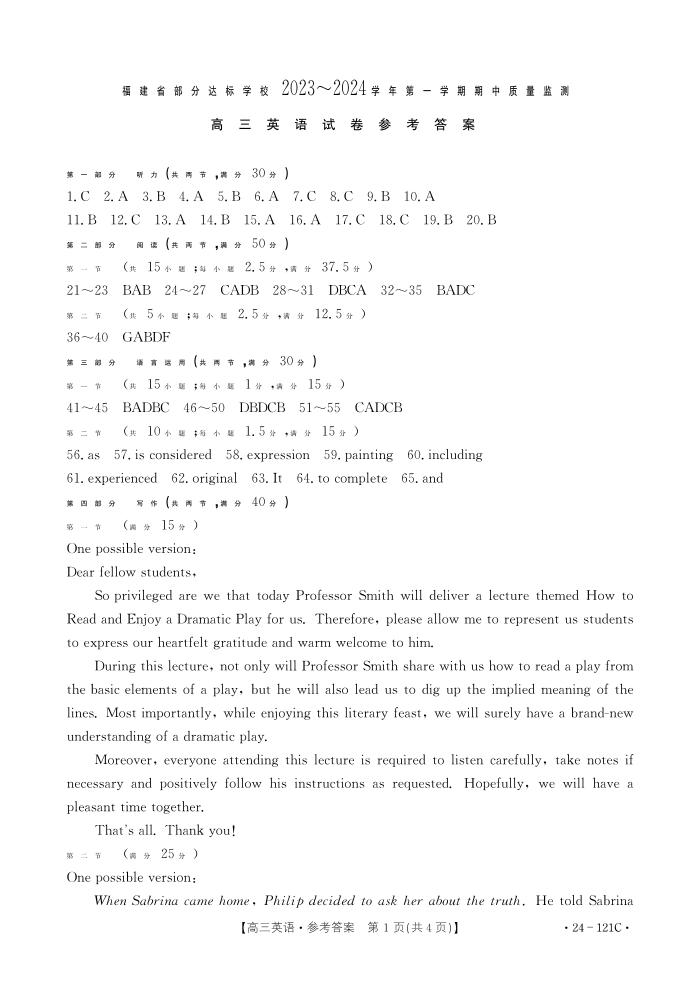福建省部分达标学校2023-2024学年高三上学期期中质量监测 英语答案