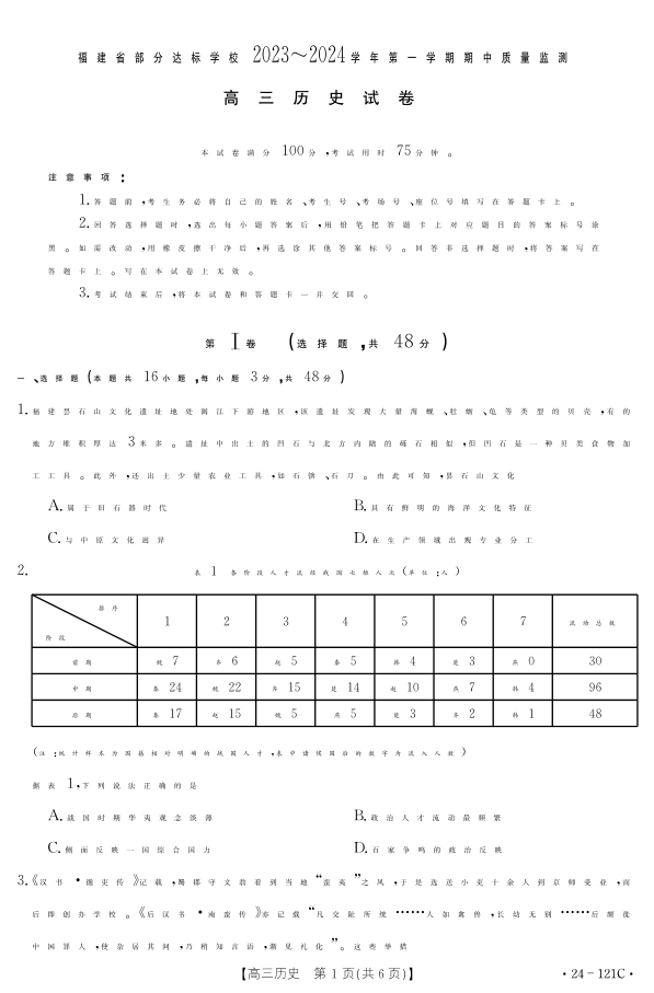 福建省部分达标学校2023-2024学年高三上学期期中质量监测 历史