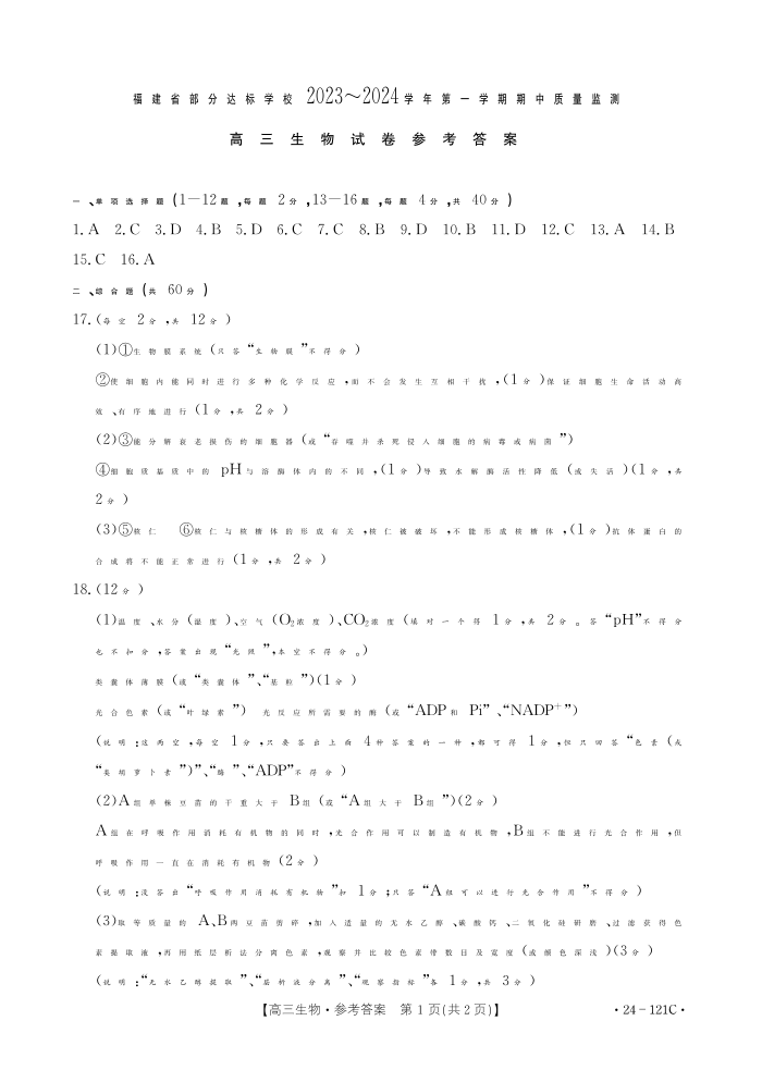 福建省部分达标学校2023-2024学年高三上学期期中质量监测 生物答案