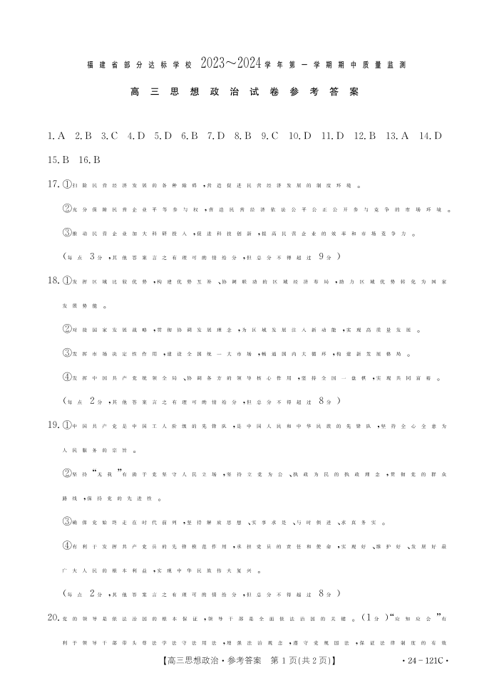福建省部分达标学校2023-2024学年高三上学期期中质量监测 思想政治答案