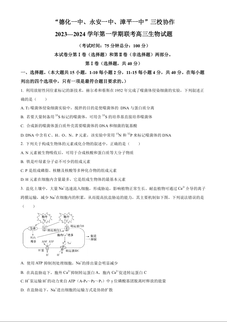 福建省德化一中、永安一中、漳平一中三校协作2023-2024学年高三上学期12月联考试题 生物