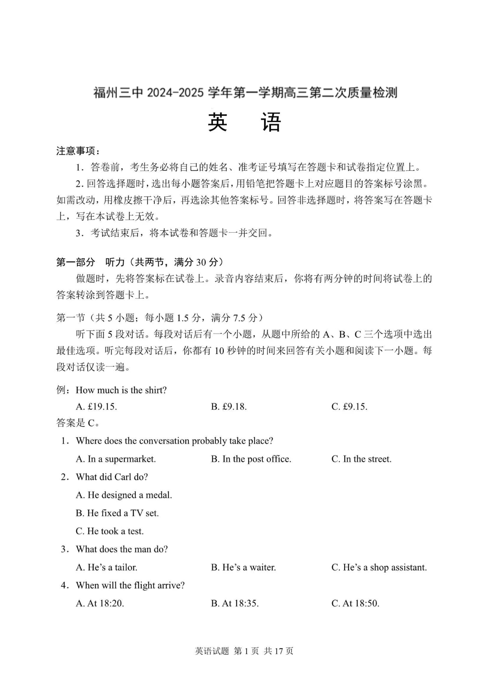 福州三中2024-2025学年第一学期高三第二次质量检测+英语