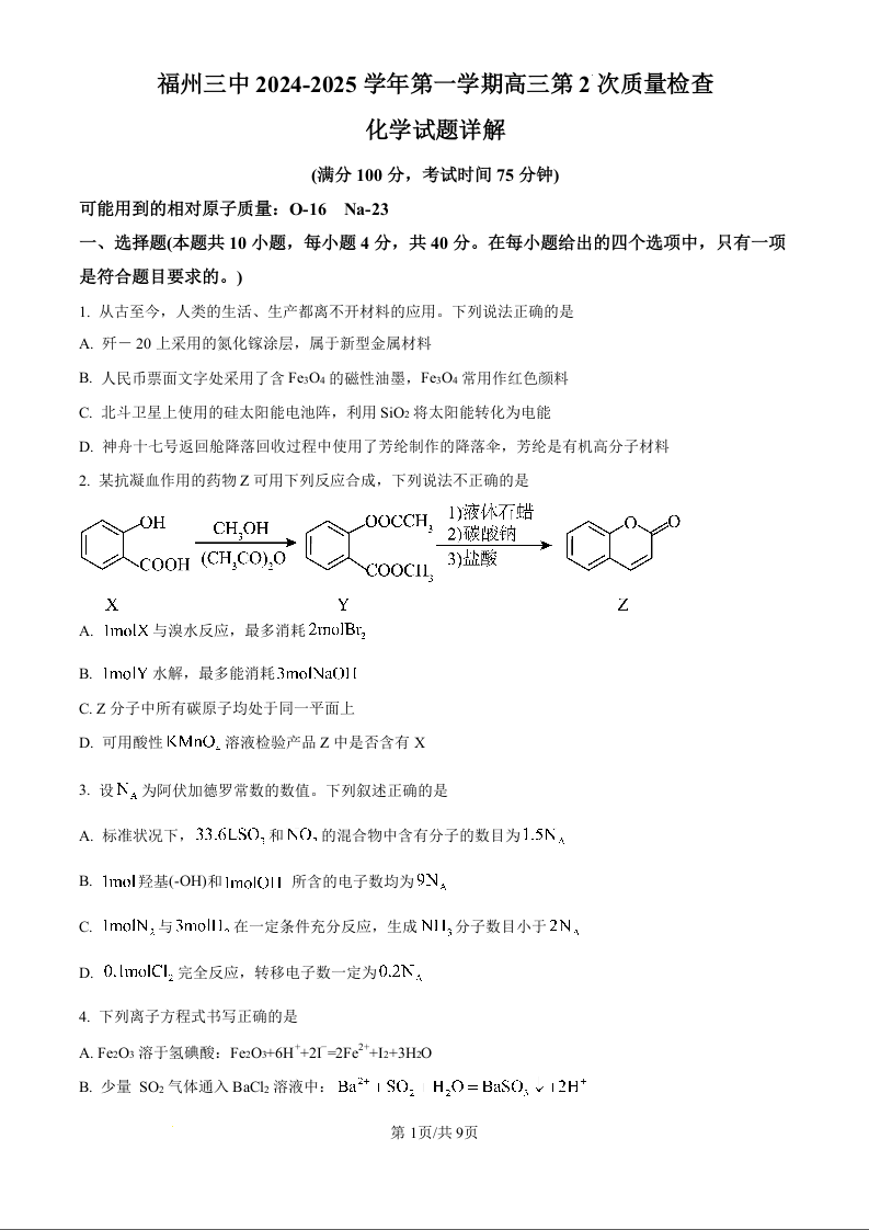 福州三中2024-2025学年第一学期高三第二次质量检测+化学
