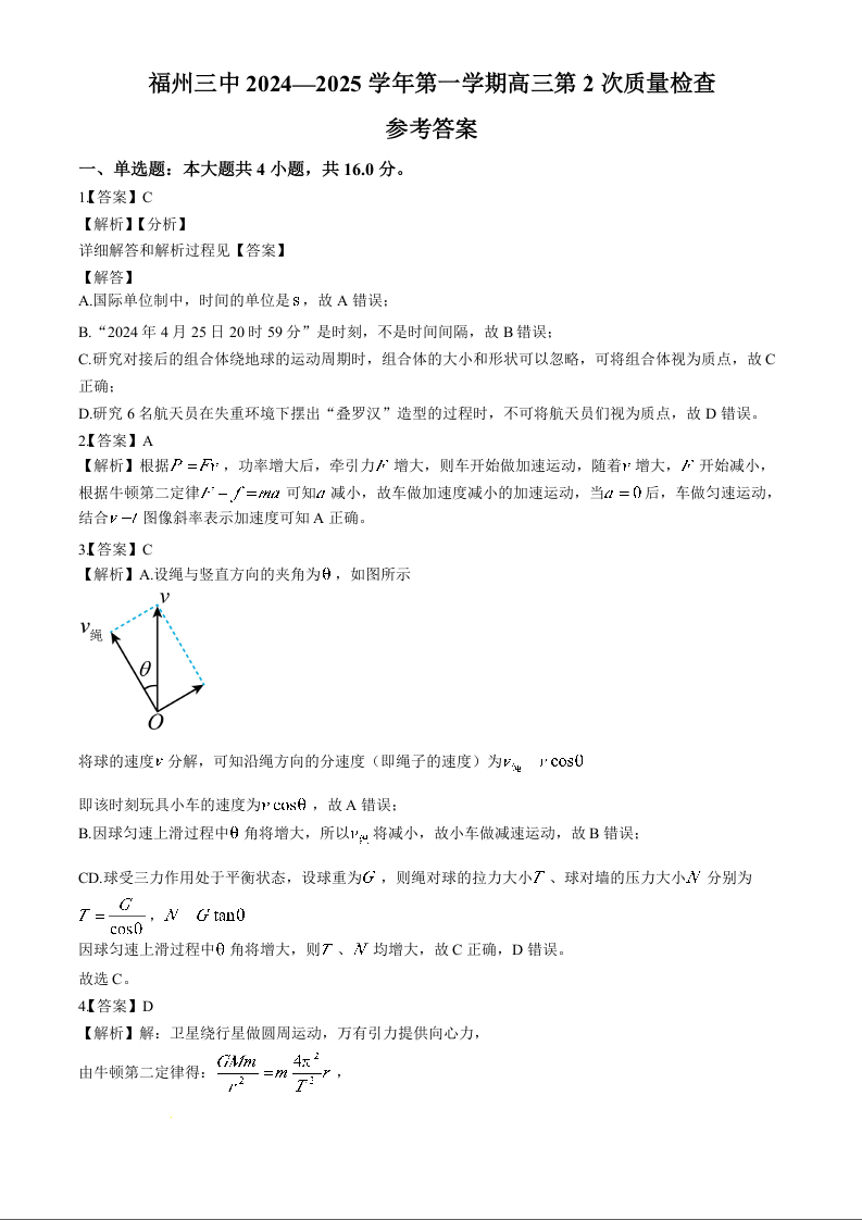 福州三中2024-2025学年第一学期高三第二次质量检测+物理答案