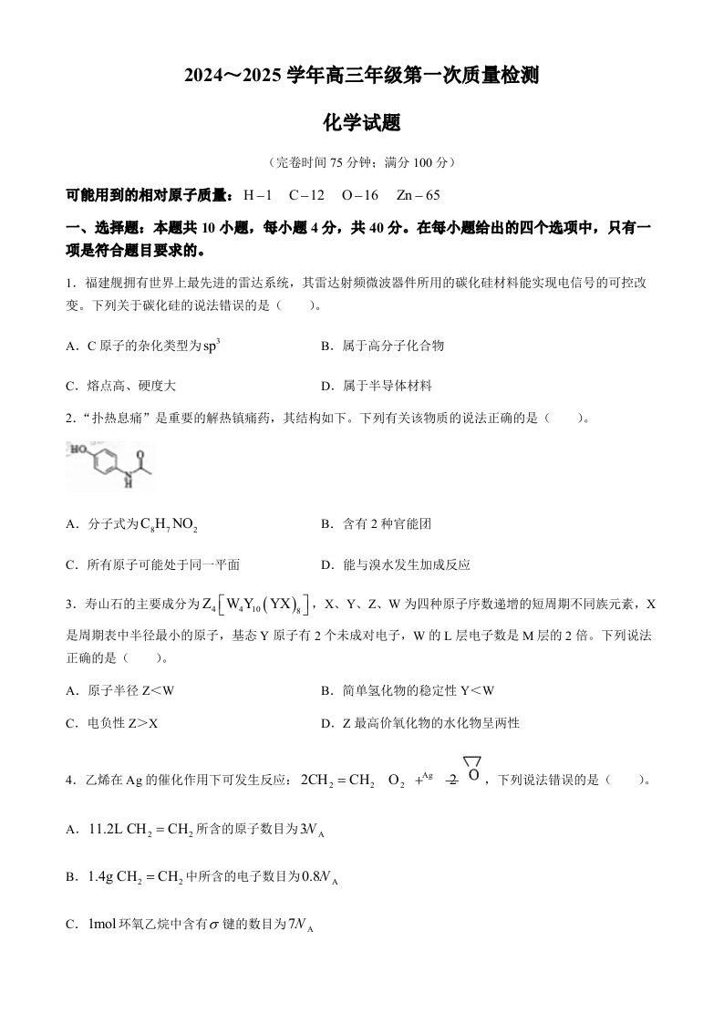 福建省福州市2024-2025学年高三年级上学期第一次质量检测+化学