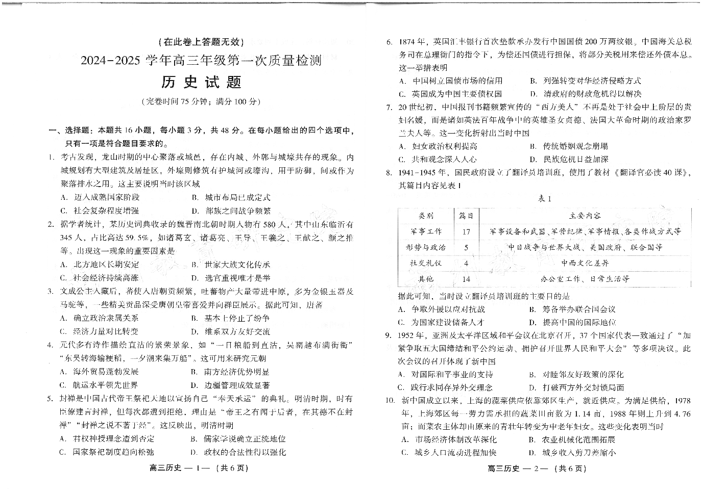 福建省福州市2024-2025学年高三年级上学期第一次质量检测+历史