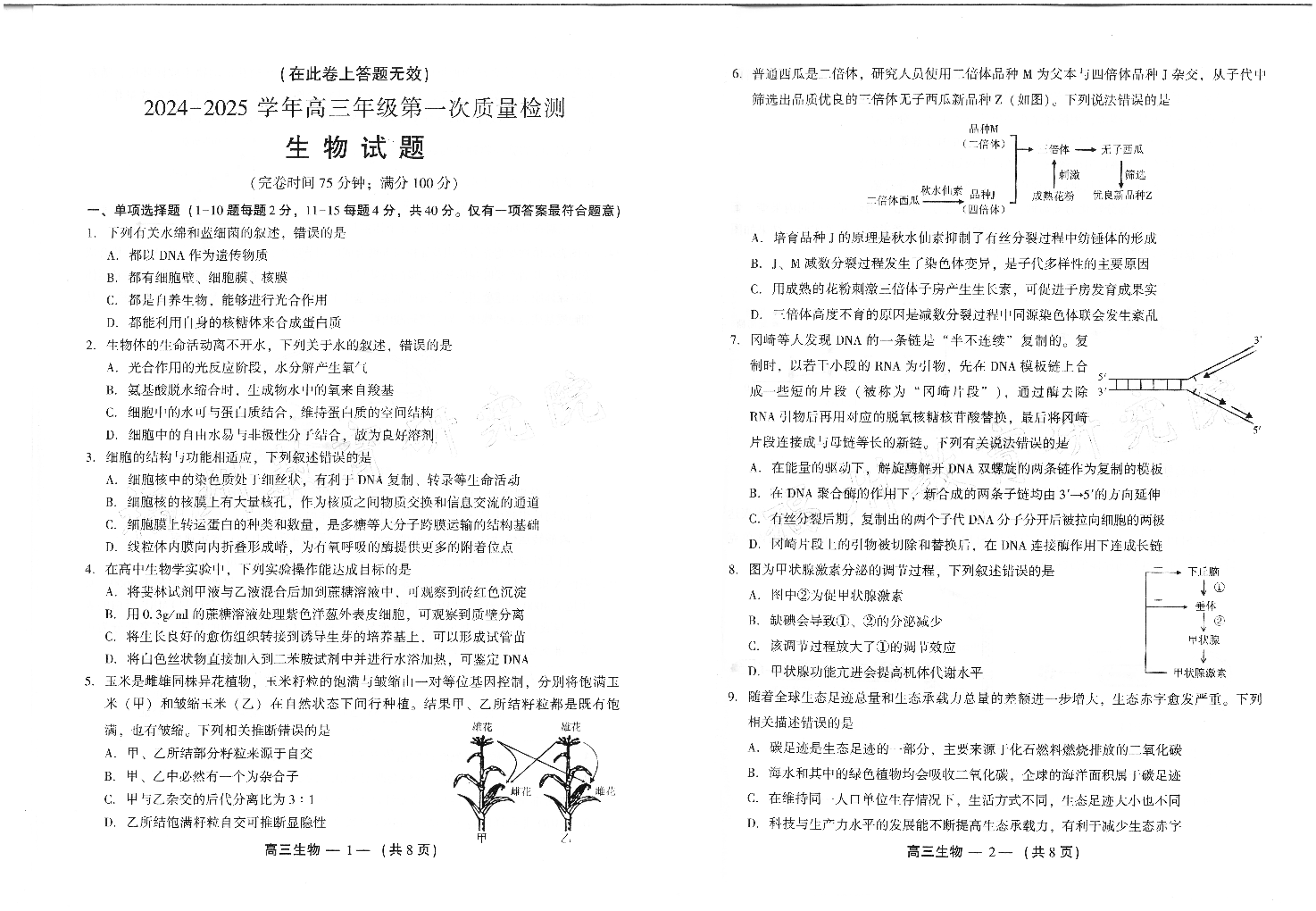 福建省福州市2024-2025学年高三年级上学期第一次质量检测+生物