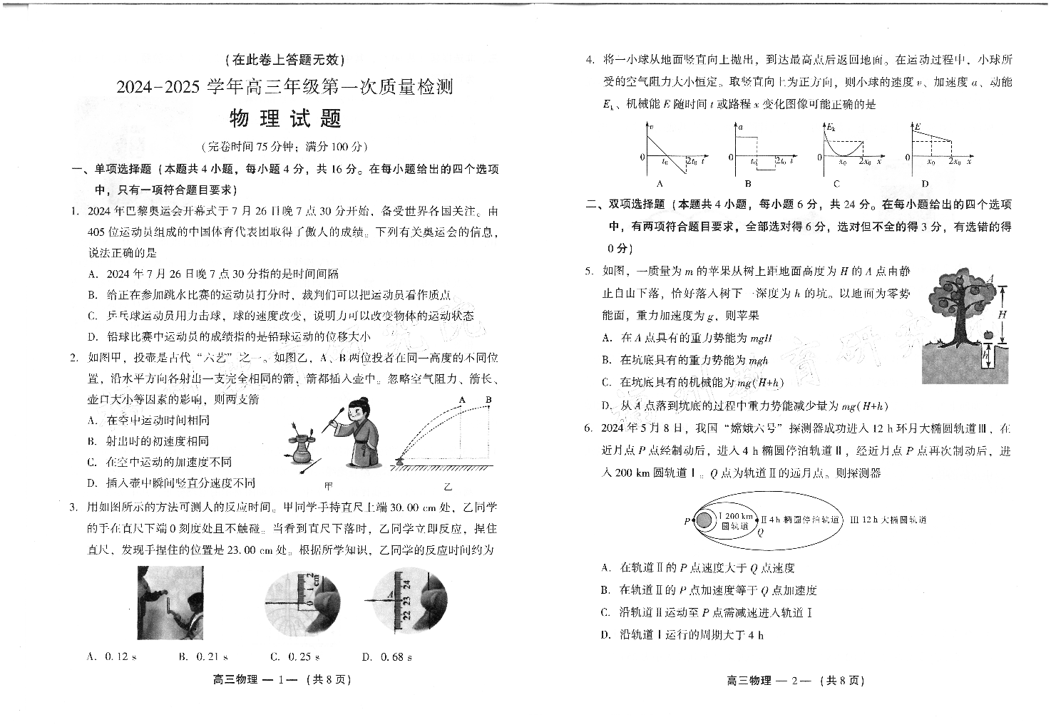 福建省福州市2024-2025学年高三年级上学期第一次质量检测+物理
