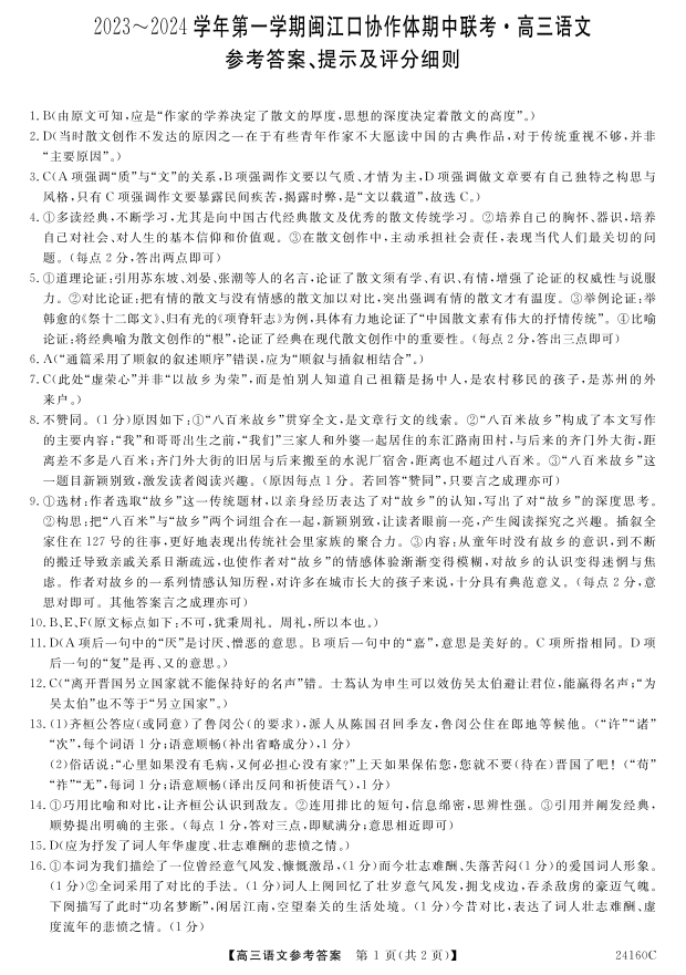 福建省福州市闽江口协作体2023-2024学年高三上学期11月期中联考 语文答案